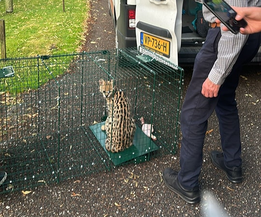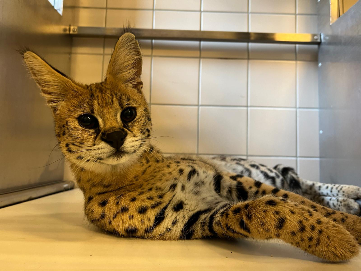 Serval Noa im Käfig der Tierambulanz. Foto: Dierenambulance Vianen en omgeving.